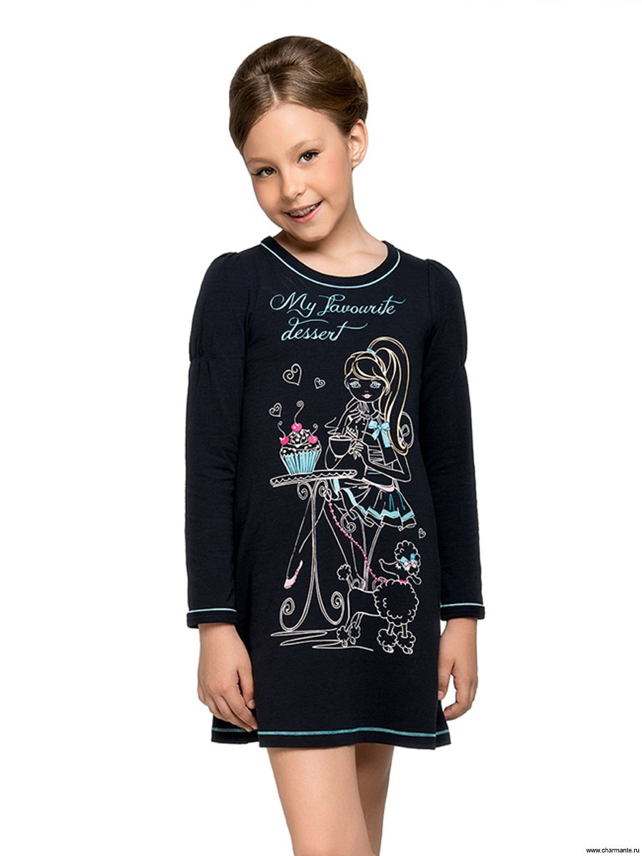 Стильное платье-туника свободного трапециевидного силуэта, с длинными рукавами с лёгкими сборками по окату и декоративной сборкой, создающей имитацию . Горловина и низ рукавов отделаны контрастной окантовкой. Модель выполнена из высококачественного хлопчатобумажного трикотажа высшего качества с добавлением эластана, в чёрном цвете, с эффектным монопринтом по передней детали изделия и изящным маленьким логотипом - по задней детали изделия. Платье отлично сочетается с моделями трусиков и лосин из коллекции , но при этом может являться самостоятельной деталью гардероба юной мисс.