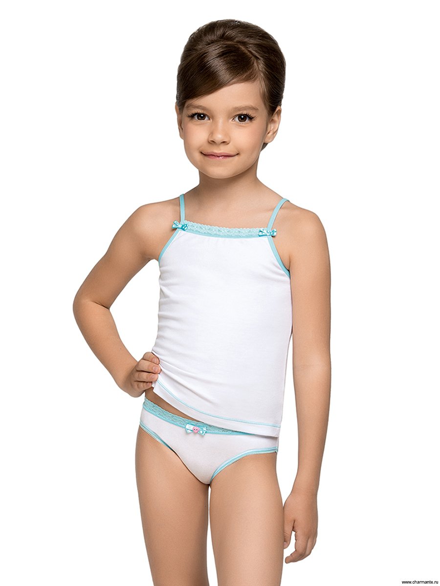 Комплект изысканного нижнего белья для девочек. Майка-топ элегантного стиля, облегающего силуэта, на тонких контрастных бретелях с маленькими бантиками и эластичным кружевом по линии декольте. Заднюю деталь топа украшает логотип, выполненный в стиле коллекции. Трусики комфортной посадки, с узким бочком и отделкой нижних срезов изделия эластичной резинкой с фестонным краем. Пояс трусиков декорирован нежно-голубым кружевом с шёлковым бантиком и пуговицей в виде сердечка. Комплект выполнен из высококачественного хлопка с добавлением эластана для улучшенной посадки и предотвращения деформации при стирке