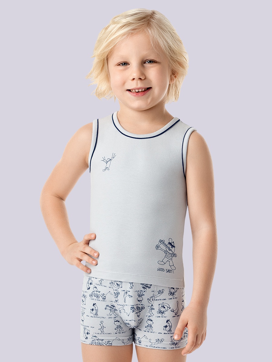Майка для мальчиков представлена в широком размерном ряду. Модель классического кроя, полуприлегающего силуэта, удлиненного типа под заправку. Изделие выполнено из однотонного трикотажа серого цвета с тематическим принтом в стиле комиксов и надписью <