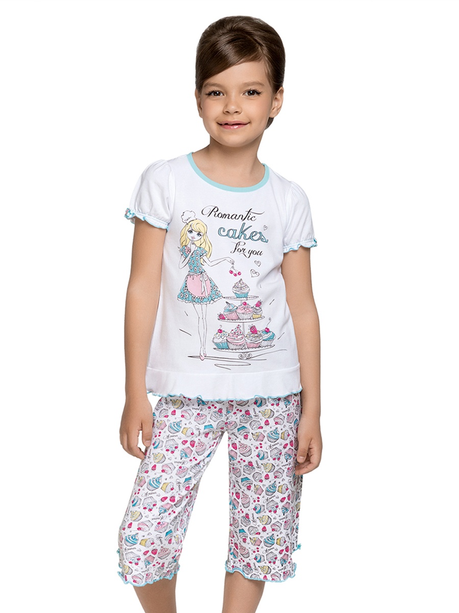 Комфортная пижама для девочек. Блуза свободного трапециевидного силуэта с контрастным кантом нежно-голубого цвета по горловине и лёгким воланом по низу изделия и рукавом типа <<фонарик>>. Бриджи свободного кроя, классической посадки, на поясе <<запакованного>> типа обработаны по низу микрооверлоком и украшены маленьким шёлковым бантиком. Великолепное сочетание гламурного принта <