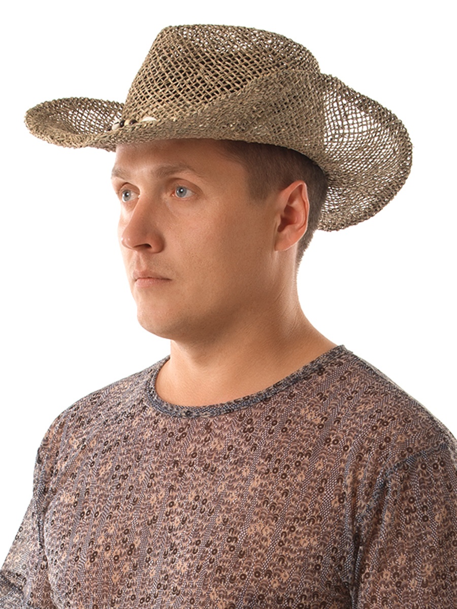 Стильная мужская шляпа в ковбойском стиле, с гибкими полями и плетением, обеспечивающим циркуляцию воздуха. Декор в виде ракушек, деревянных бусин и соломенного ремешка придает изделию законченный вид.