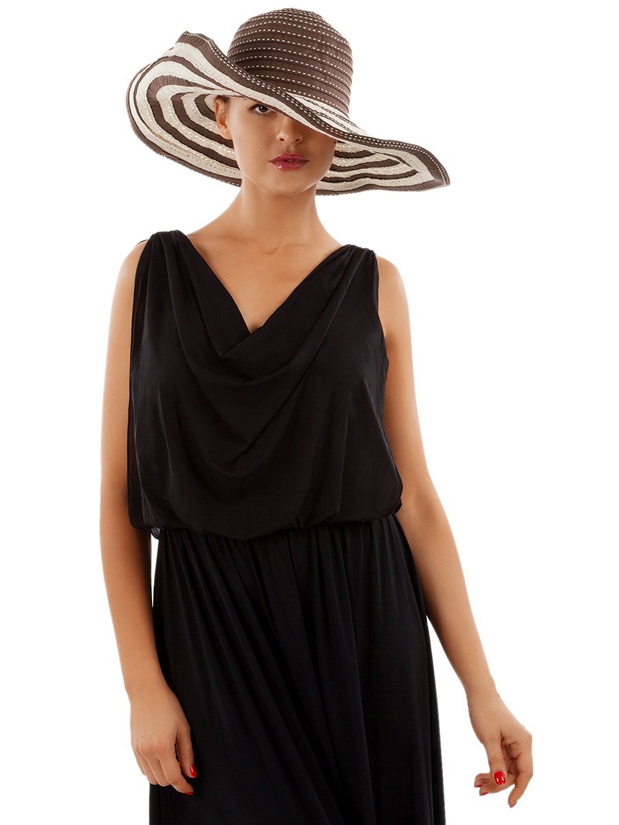 Элегантная шляпа с гибкими полями, позволяющими принимать любую форму по вашему желанию. Модель изготовлена из однотонной ткани, декорированной кружевными контрастными лентами. Аккуратный бант, оформленный кружевом, и декоративная строчка служат украшениями изделия.