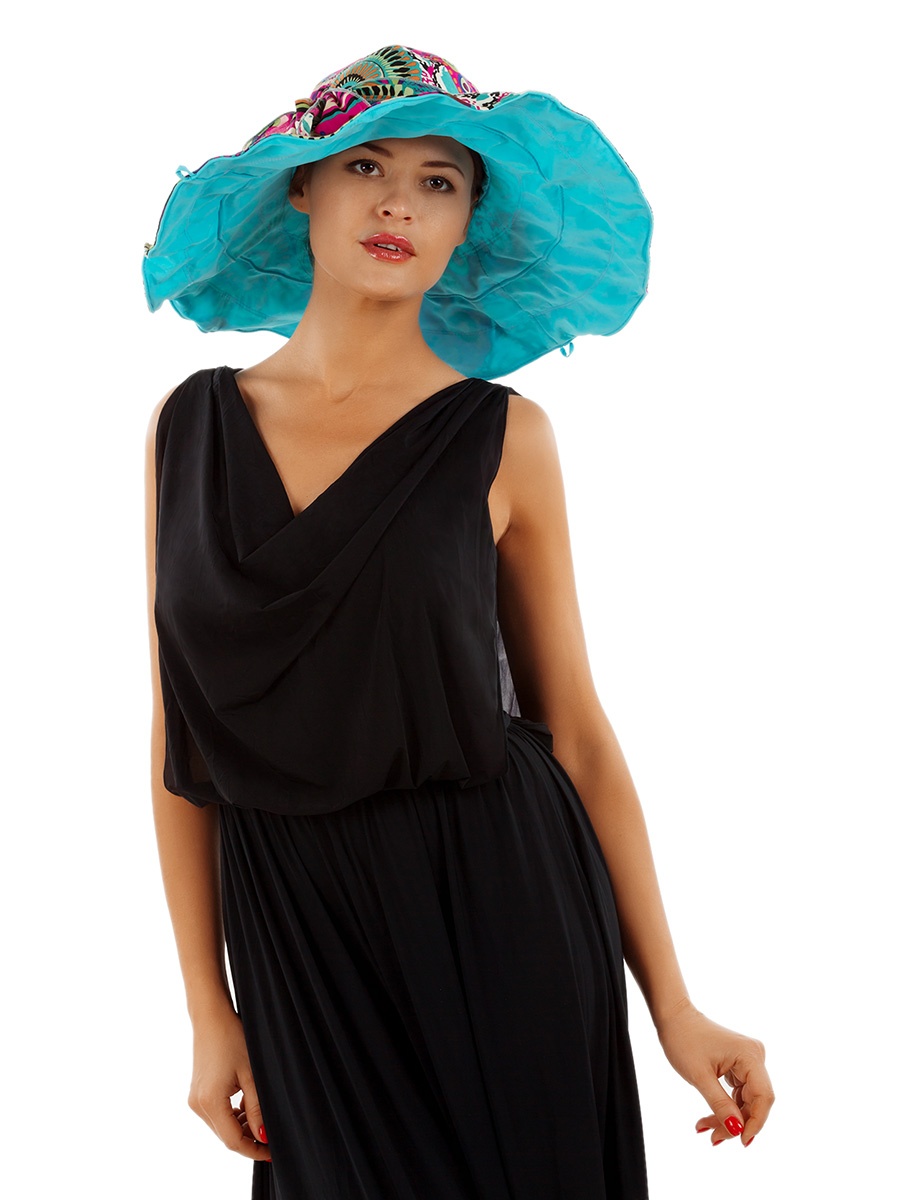Мягкая женская двусторонняя шляпа из ткани, с гибкими полями и пуговками на тулье, позволяющими менять форму по своему желанию. Изделие можно носить как цветной стороной, так и однотонной. Отдельно в комплекте прилагается контрастная пестрая лента, которую можно завязать вокруг тульи. Шнурков - нет.
