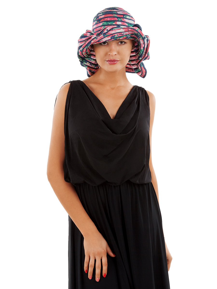 Женская шляпа типа американка с гибкими полями, позволяющими принимать любую форму по вашему желанию. Изготовлена из ткани с цветочным дизайном и синтетического материала. Превосходно защищает от солнечных лучей. Изделие дополнено эффектной розой в тон изделию. С внутренней стороны тулья снабжена специальными шнурками, позволяющими регулировать объем.