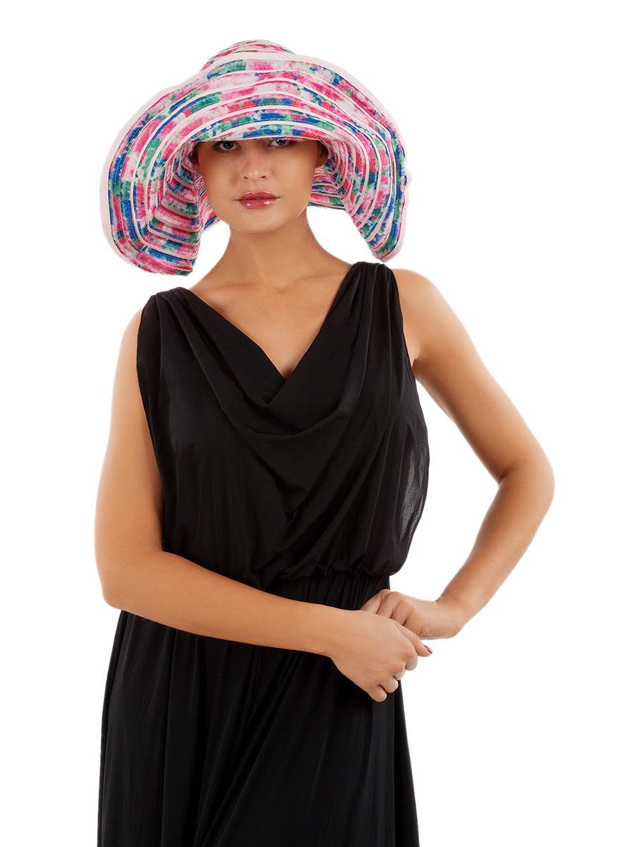 Женская шляпа типа американка с гибкими полями, позволяющими принимать любую форму по вашему желанию. Изготовлена из ткани с цветочным дизайном и синтетического материала. Превосходно защищает от солнечных лучей. Изделие дополнено эффектной розой в тон изделию. С внутренней стороны тулья снабжена специальными шнурками, позволяющими регулировать объем.