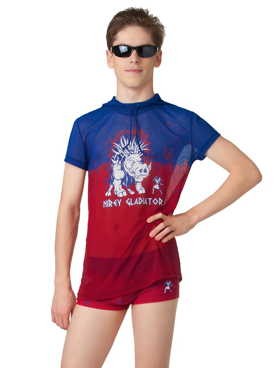 Удобная футболка с капюшоном и коротким рукавом из мягкой эластичной сетки с антисолнечным эффектом. Незаменимый предмет пляжного гардероба каждого мальчика. Модный стиль с капюшоном на кулиске, что позволяет уберечь шею и плечи от солнечных ожогов, классические рукава с правильной линией проймы -- идеальная модель максимально комфортной посадки. Футболка отлично подходит для длительного пребывания на солнце, купания в бассейнах и открытых водоёмах под присмотром взрослых. Изделие создаёт эффект лёгкой прохлады, не подвержено быстрому загрязнению, легко стирается, быстро сохнет, не деформируется, не требует глажки и компактно в хранении. Модель выполнена в сложной технике детального размещениия рисунка на изделии, с дизайнерским принтом "Дикий вепрь и гладиатор".